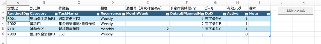 • 定型タスク以外のタスクを一行ずつ追加していきます。