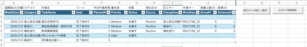その際は、「Weekly_Plan」シートで完了したタスクの「Status」項目を「完了」にした後、『日次ログ候補更新』を押下してください。