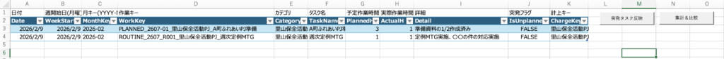 特に「PlannedH」は入力後、その合計を見ることで今週どれだけの時間余力があるか